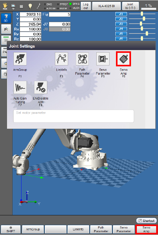 After the [Joint Settings] window appears, press [F6 Servo Amp].