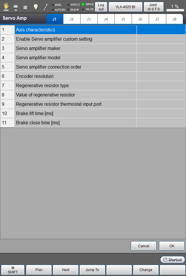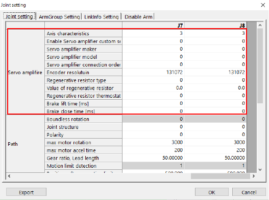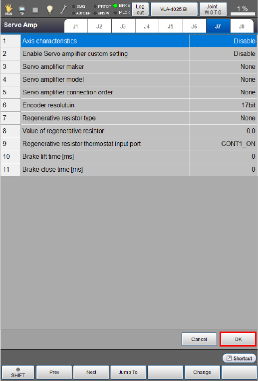 Adjust servo amp parameters in the [Joint Setting] tab on the [Joint Setting] screen.