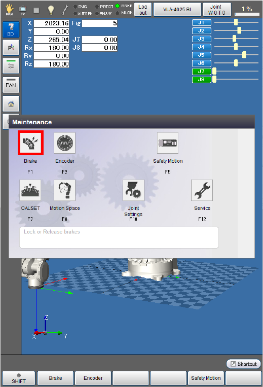 Press the button of the joint for which the brake is to be released. The indicator of the button turns into "Free".