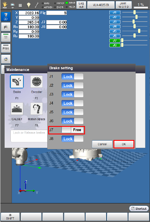 A system message appears to confirm whether to change the brake settings, then press the [OK] button on the smart TP to change the settings.