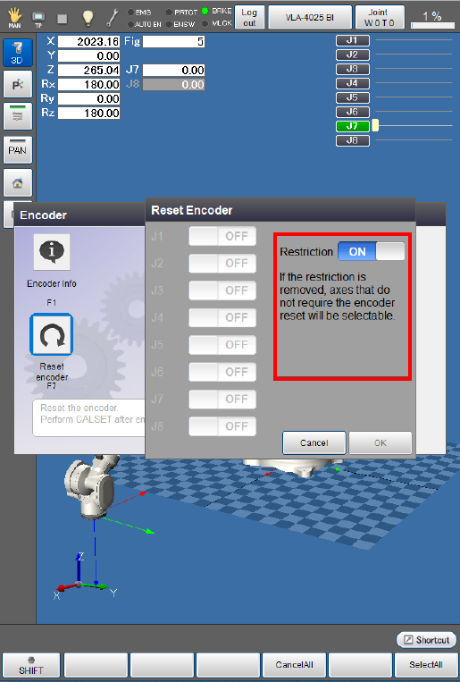 If [8540467* *-axis:Encoder System Down] is displayed or [8540468* *-axis:Encoder over speed error] is displayed due to excessive impact at that time of the controller power off, the encoder must be reset and CALSET work must be done.