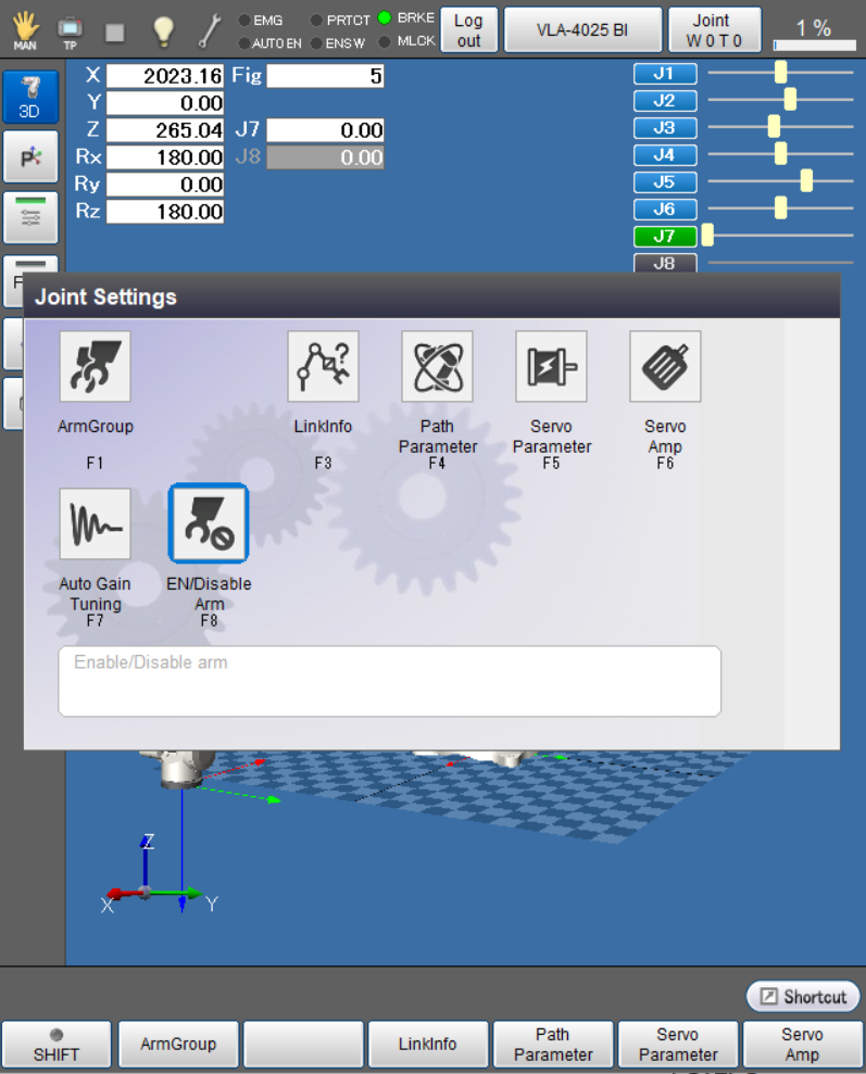 If the setting has changed properly, the position information bar shown on the upper right of the window turns to gray, which means the robot arm is disabled. In this example, J1 to J6 are gray.