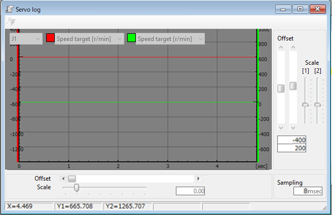 If no error occurs when the auxiliary axis is being driven with the external speed 100%, import the data to WINCAPSIII and display the graph from the single-joint servo data log.