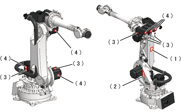 The robot unit has warning and caution labels pasted as shown below. They alert the user to the dangers of the areas on which they are pasted. Be sure to observe the instructions printed on those labels.