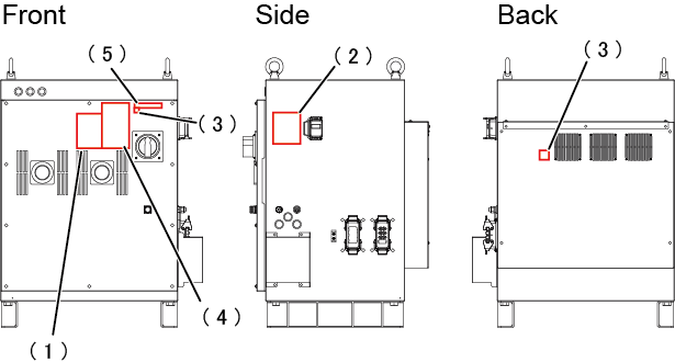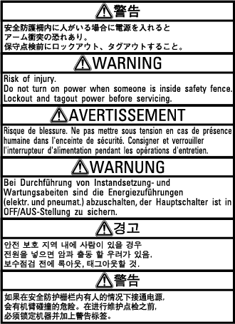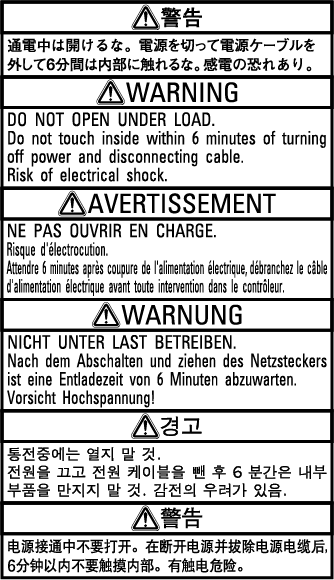 The controller has warning and caution labels pasted as shown below. They alert the user to the dangers of and precautions for the areas on which they are pasted. Be sure to observe the instructions printed on those labels.