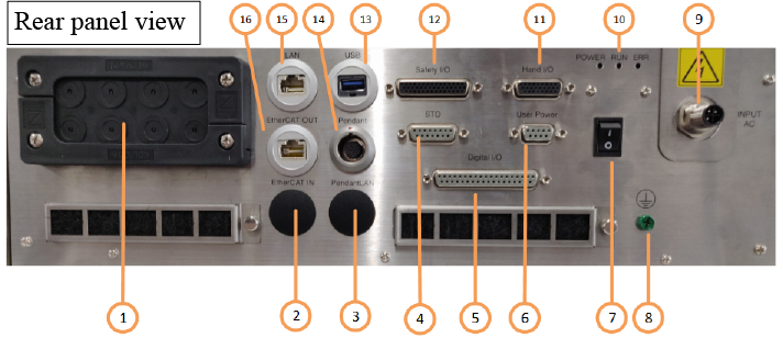 | 12 | Safety I/O connector | To connect a safety signal-related signal line. |