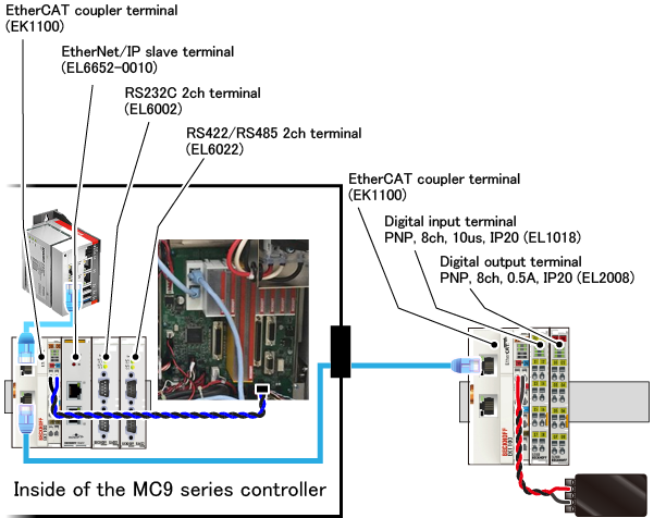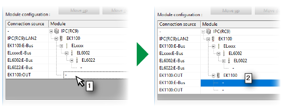 The EK1100 outside of the MC9 series controller is connected to the EtharCAT signal output connector of the EK1100 inside of the MC9 series controller. In this case, add the EK1100 outside of the MC9 series controller to "EK1100:OUT" in "Module configuration" pane.