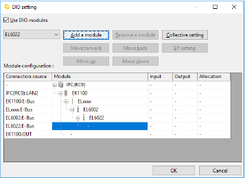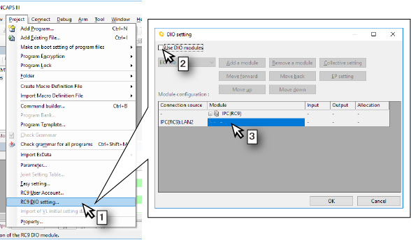 - Select the check box of [Use DIO modules] on the [DIO setting] window.