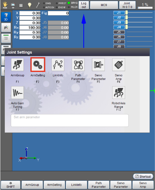 Top screen - [F2 Arm] - [F12 Maintenance] - [F10 Joint Settings] - [F2 ArmSetting]