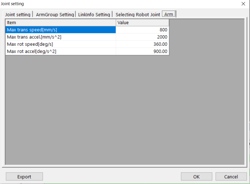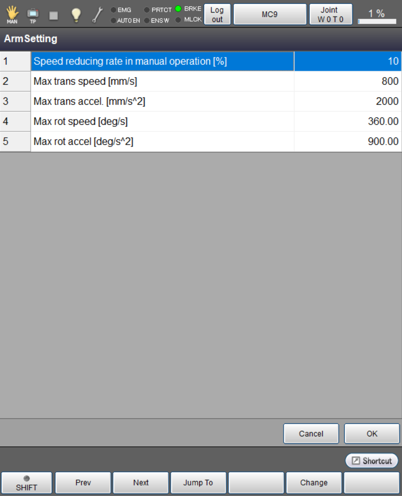 | Max trans accel | 1 to 100000000 | 2000 | mm/s2 | Set the maximum translation acceleration in CP motion. |