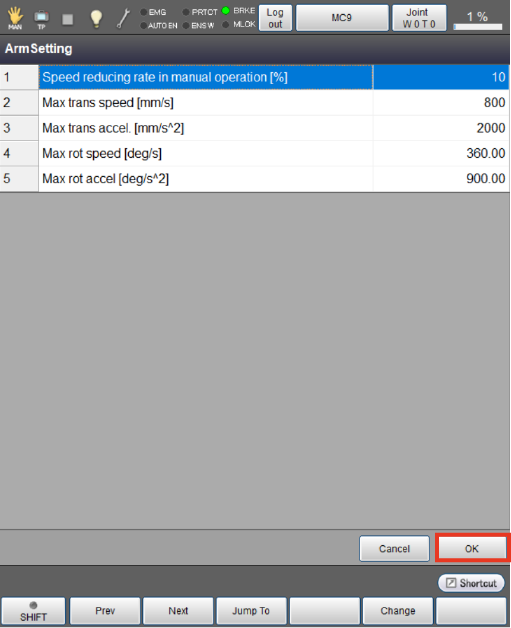 This will save the arm parameter setting and take you back to the [Joint Settings] screen.