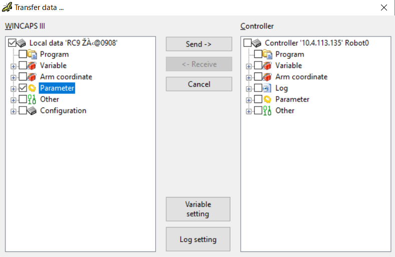 In the [Transfer data] dialog, check parameter boxes and press the [Send] button.