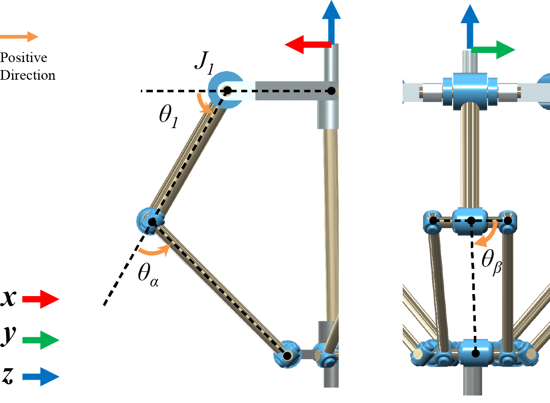 When selected a parallel link robot as robot type, the motion range of θα, θβshown in the figure as well as the limits of motion range of the motor shaft angle (θ1) need to be set for a breakage prevention of the elbow portion.