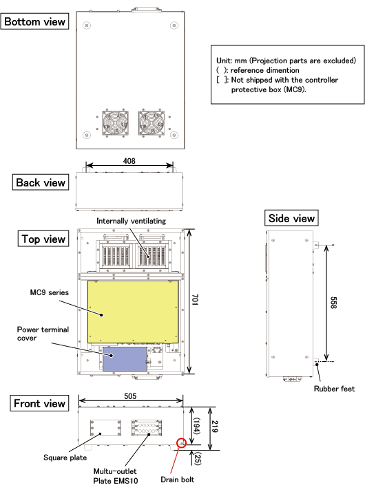 The figure below shows the names of the components of the controller protective box (MC9) and dimensions.
