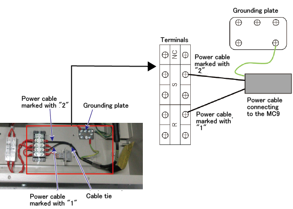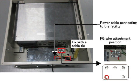 Once the power cable is laid, fix the electric wires with a cable tie, and then put the terminal board cover (plastic) and the terminal board cover (metal plate) back in place.