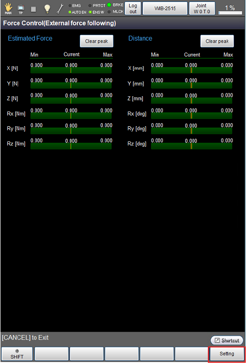 On the [Force Control (External force following)] screen, press [F6 Setting].