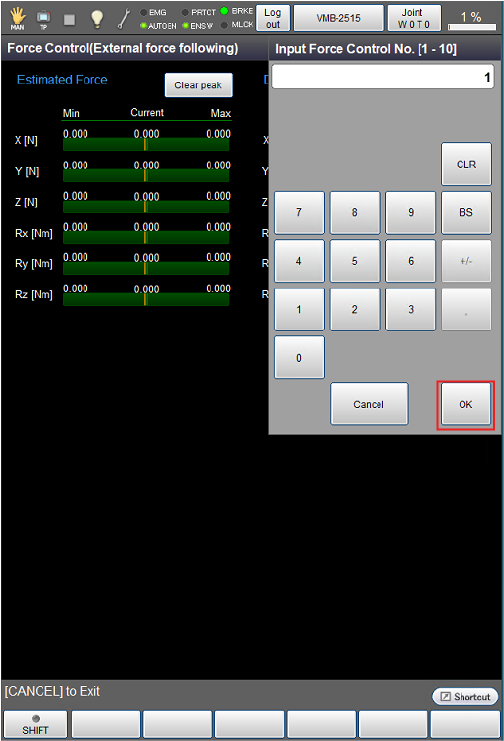 A numeric keypad for entering a force control number appears. Use the keypad to enter a force control number.