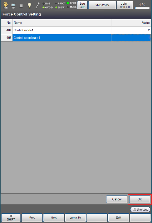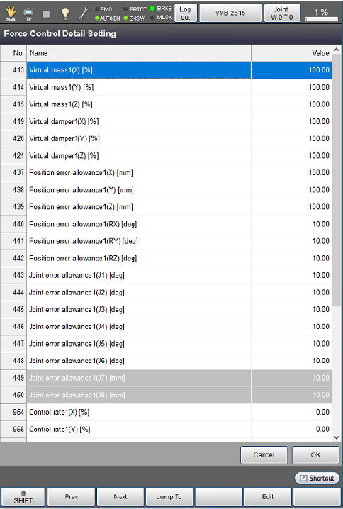 Force control number is a table number for specifying the parameters. You can select from 1 to 10.