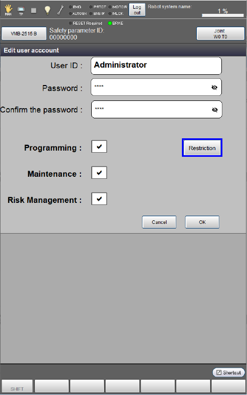 In either [Add user account] or [Change user account information], select [Programming] and press the [Restriction] button enclosed by the blue square.