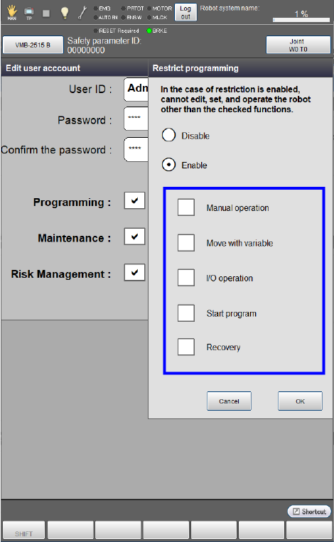 When specifying the Programming (restricted) permission, you can choose whether to permit the use of the following five robot motion–related functions or not.