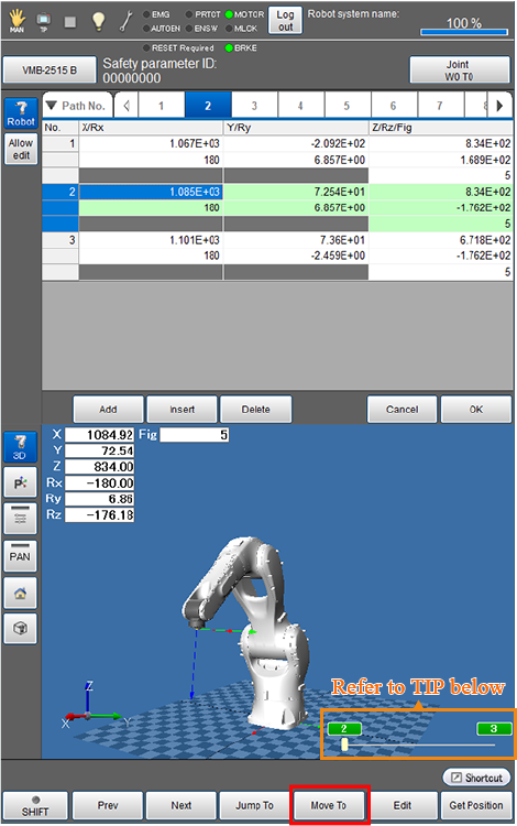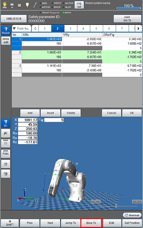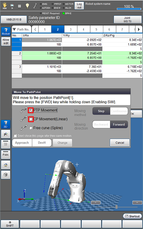 Pressing [Move To] displays [Mote To PathPoint] window. Select [PTP Movement] or [CP Movement (Linear)].