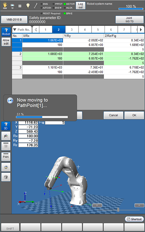 Once the path point setting window appears, press the desired [Path No.], enter the parameters of the selected path point. Selected path point is colored blue.