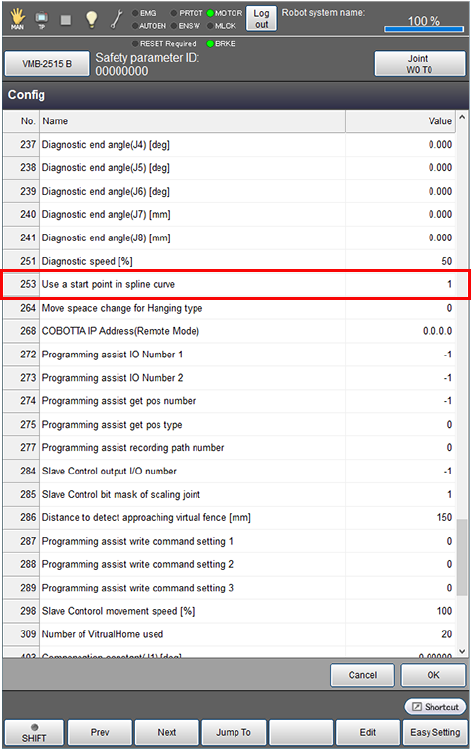 For operating the robot with free curve motion in the [Path Points Setting] window, you need to set [253: Use a start point in spline curve] to (1: Enable).