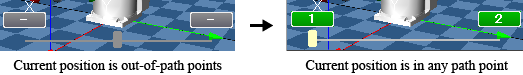 If the current position is out-of-path points, when the path point setting window appears, the path number icon is colored gray. If the current position is in any path point, the path number icon is colored green. (Ver.2.7.* or higher)