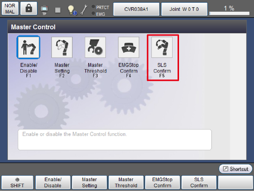 Operation path: [F6 Setting] - [F10 COBOTTA] - [F8 Master Control] - [F4 EMGStop Confirm] / [F5 SLS Confirm]