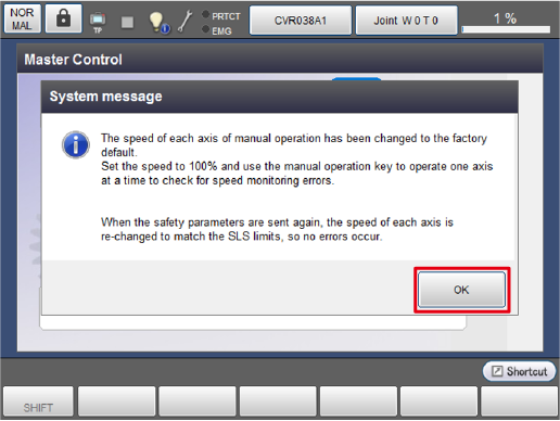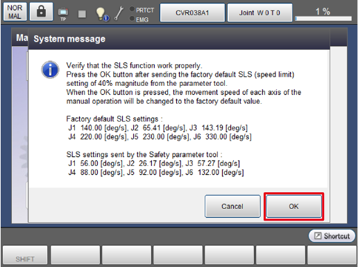 A system message appears. Send the SLS set values displayed on the message using the COBOTTA parameter tool, and then press [OK].