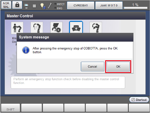 Press the Emergency Stop button for COBOTTA, and press [OK] in the system message.
