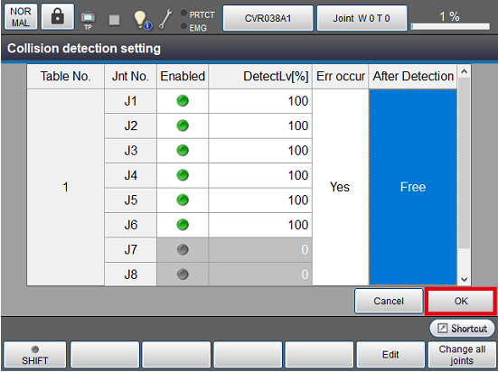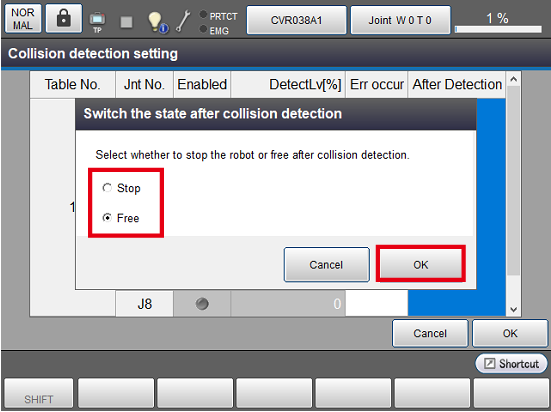 By using the Remote TP /Virtual TP or command, set whether to stop a robot on the motion path or to stop the robot after it is set to the axis free status at collision detection. For details of the command, refer to "SetCollisionDetection."