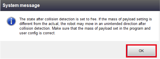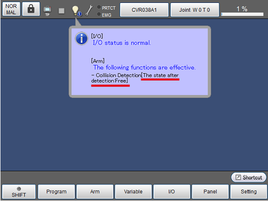 For cases other than above, the robot will stop on the motion path even if you set the axis free. For example, when moving with variables in the variable window, even if it collides, the robot will not be in the axis free status.
