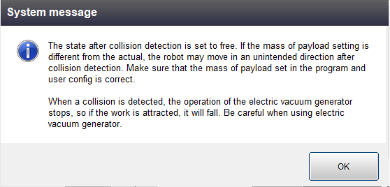 - If collision is detected when using the electric vacuum generator, the motor of the electric vacuum generator will be turned off simultaneously with end of the axis free status. Please note that when the motor is turned off while a workpiece is gripped, the workpiece will fall.