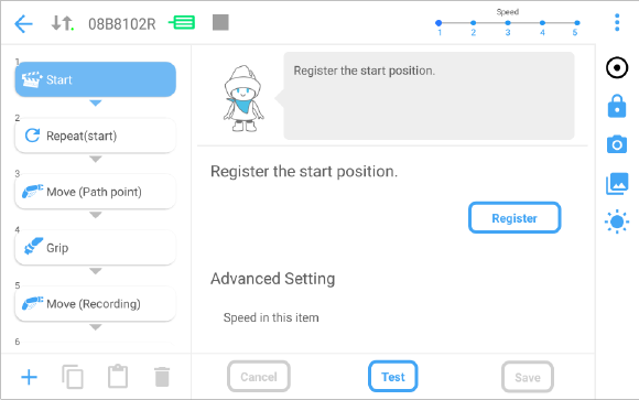 The connection of COBOTTA can be checked. When the icon is tapped, the LED of the connected COBOTTA will flash in green. |