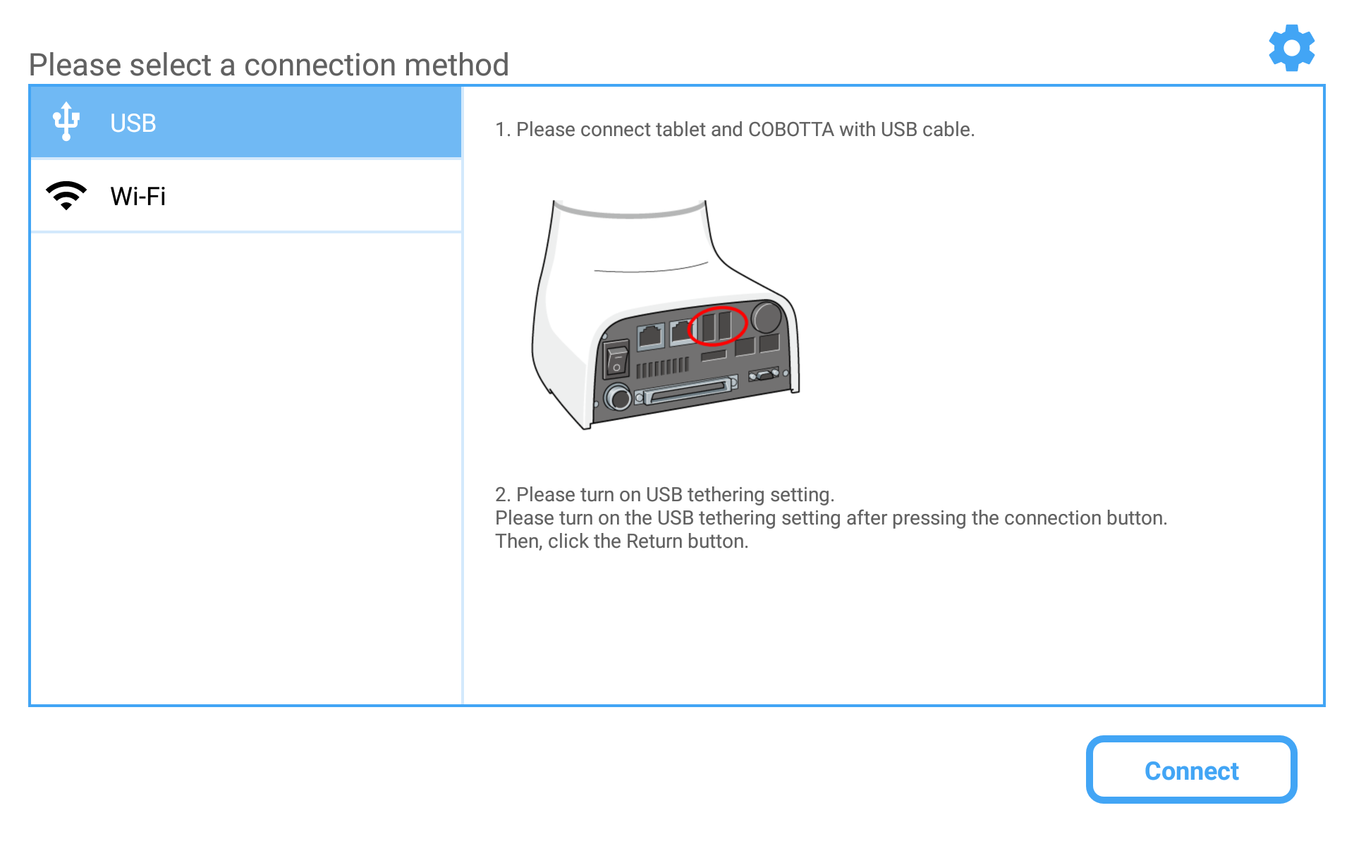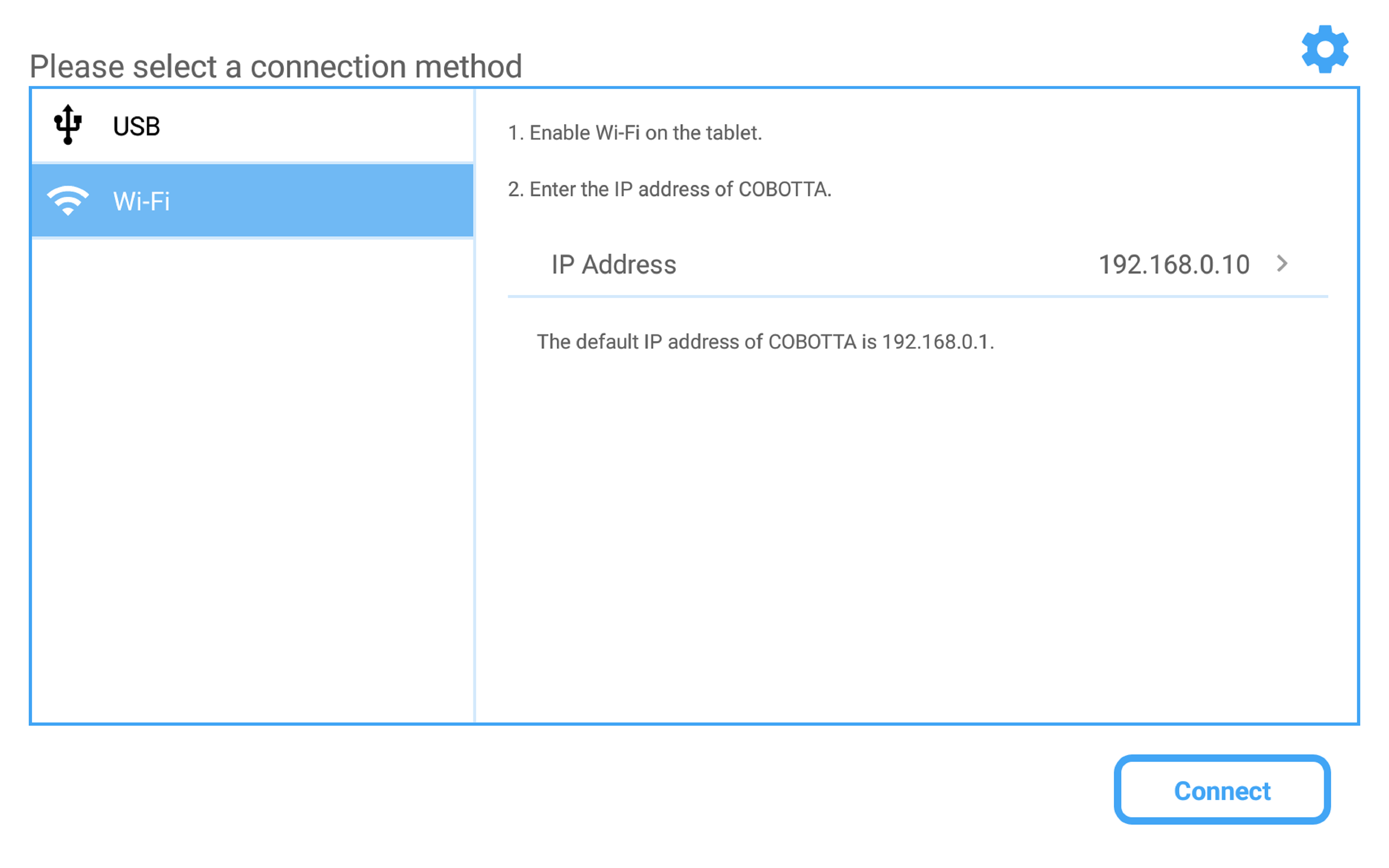 Only one tablet can connect with COBOTTA at a time. When one tablet is already connected with COBOTTA, it is not possible to connect another tablet with that COBOTTA via Wi-Fi any more.