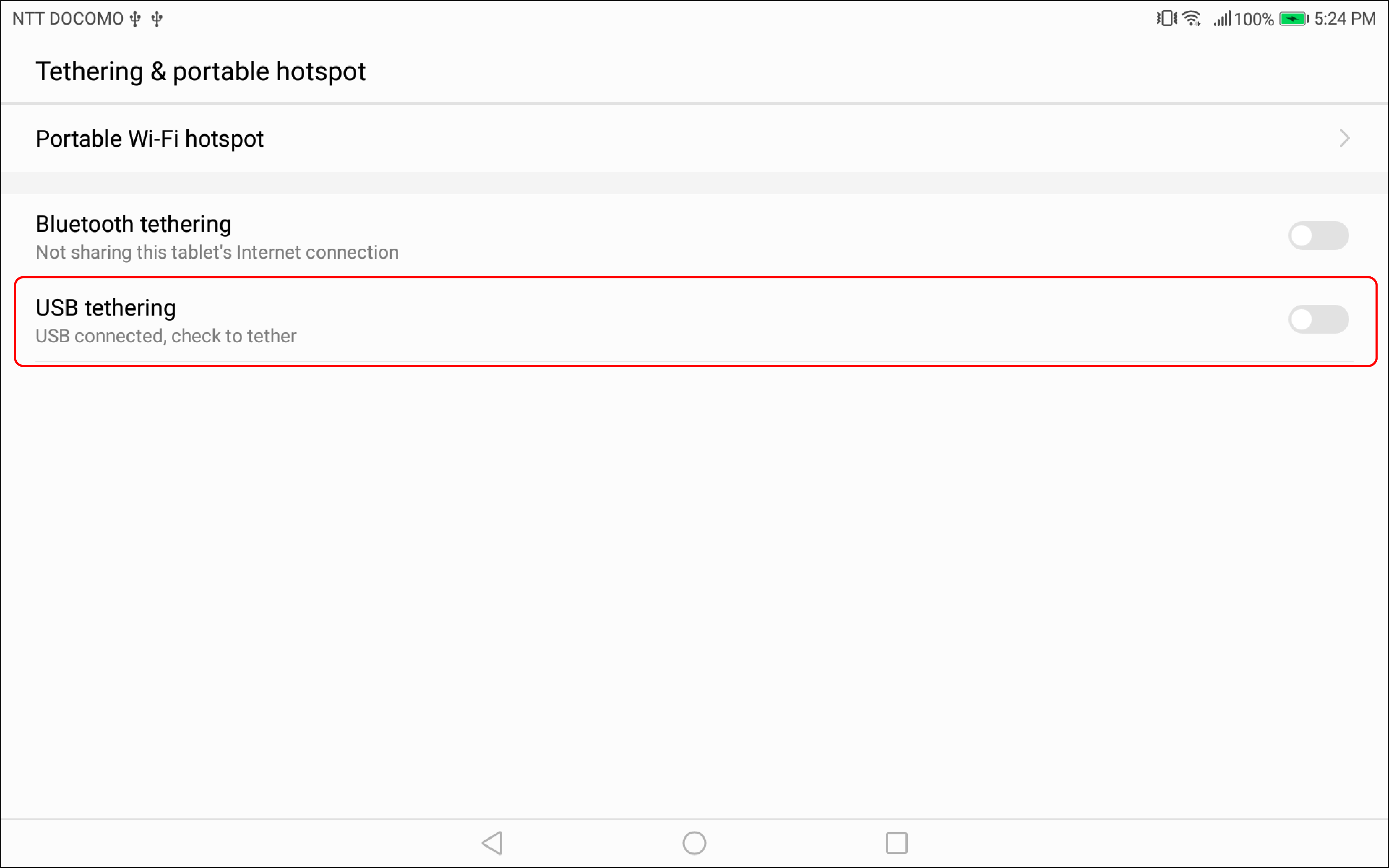 When USB tethering is not turned on, the following setting window will be displayed. Turn on [USB tethering] in this window. When USB tethering is turned ON, return to the previous window.