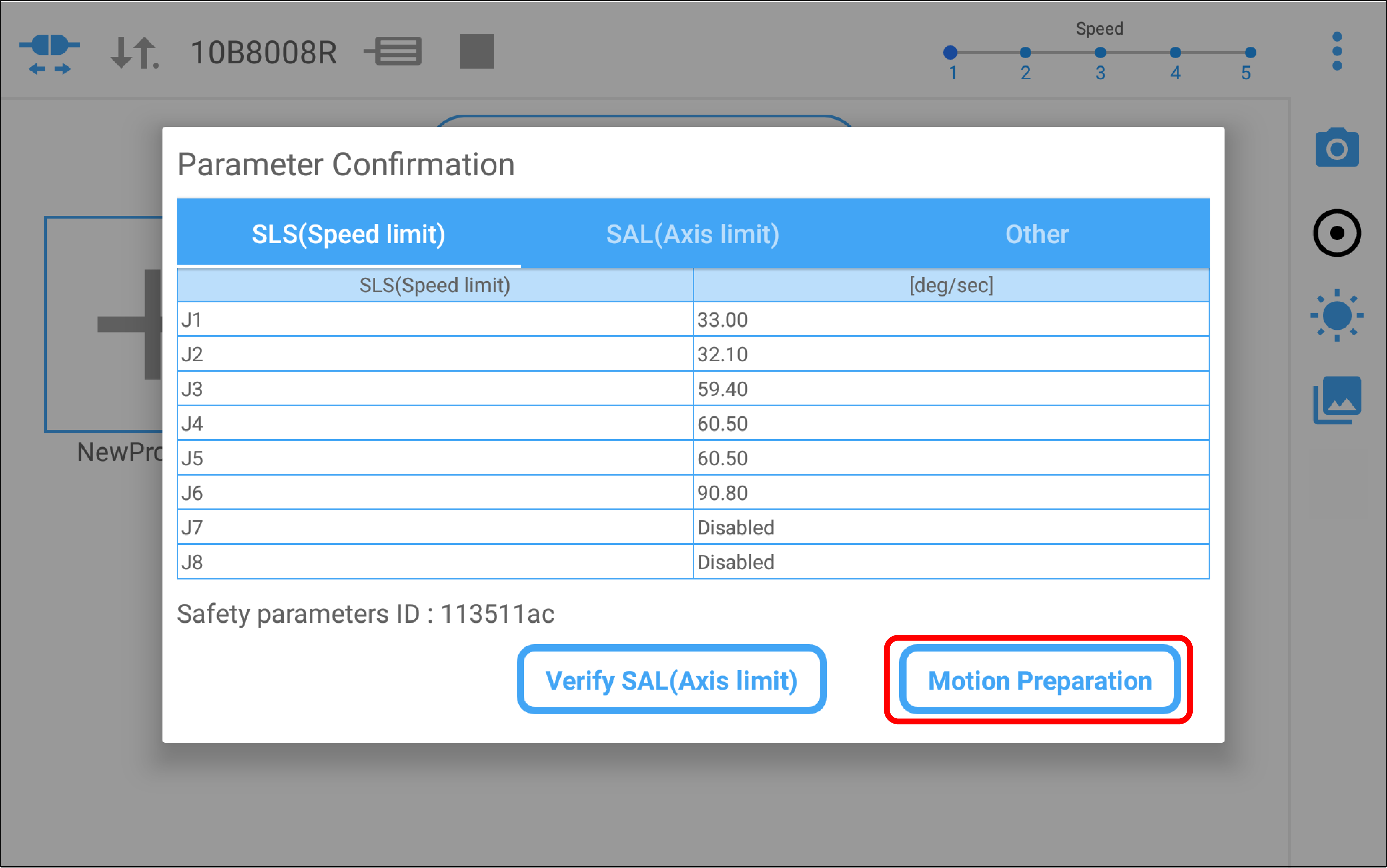 When all parameters are confirmed, [Motion Preparation] button will be enabled. Tap the [Motion Preparation] button. When the following window disappears, the motion preparation has been completed.