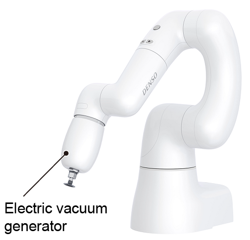 An electric vacuum generator is a tool that is mounted on the COBOTTA flange part to hold a workpiece by vacuum pressure. It holds and releases a workpiece by running a pump with a motor.