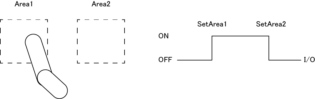 - Assuming that the same I/O is used for two areas (see the figure below), and the I/O turns ON once an object enter the detection area. When SetArea1 command is executed while an object is already exist in Area1, the I/O turns ON; however, if SetArea2 command is executed succeedingly, the I/O turns OFF.