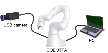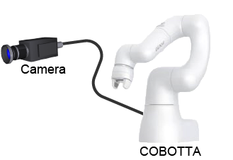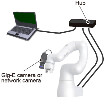 Because COBOTTA equips only one Ethernet port (for COBOTTA communication), you need to use a hub to connect both the computer and the camera.After setting and adjustment has completed, disconnect the hub and then directly connect the camera to COBOTTA.