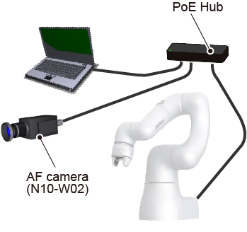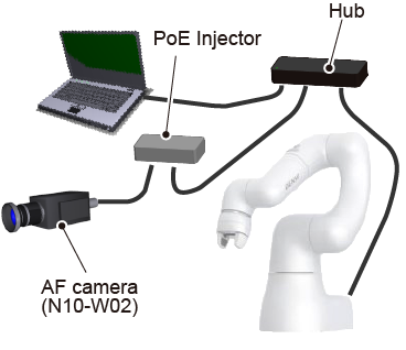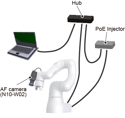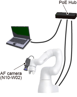 In either of the connection methods, power must be supplied from the PoE Hub or PoE Injector to the AF camera (N10-W02).