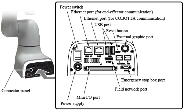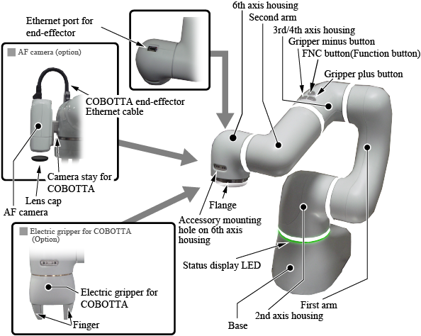 This section describes the names of components by classifying into three categories; "Names of each axis", "Name of each part", and "Names of connectors on the connector panel".