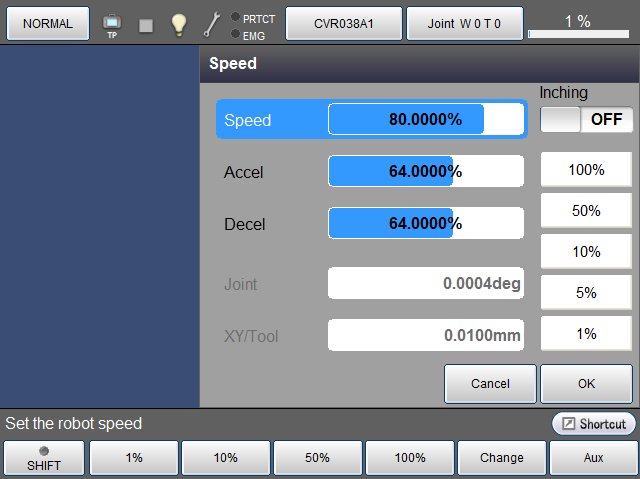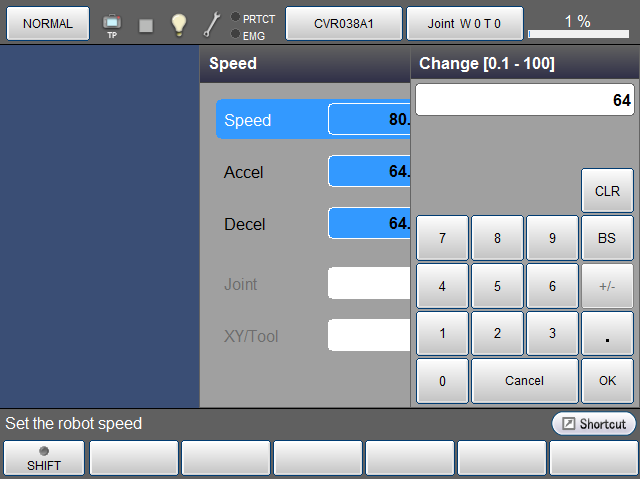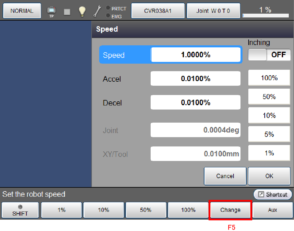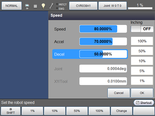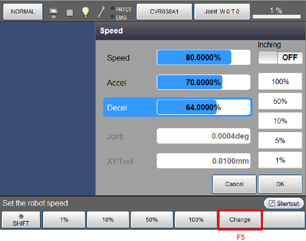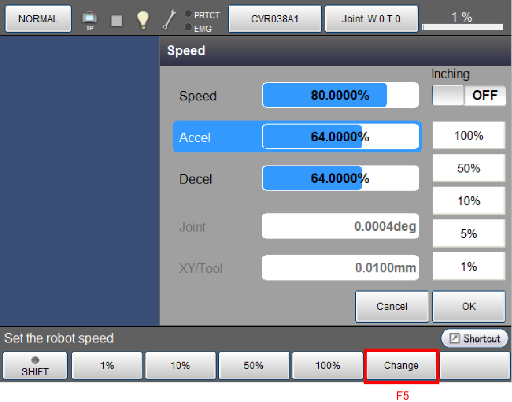 Press [Cancel] to cancel the value. The screen will return to normal. If [Cancel] is pressed here, the external speed and acceleration previously set will return to the original state.