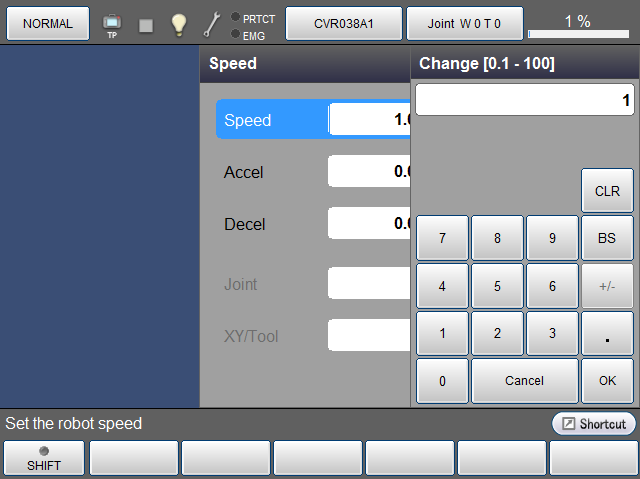 The numerical keypad is disappeared, and the acceleration is updated with the entered value as shown below. Press [Cancel] to cancel updating. The screen will return to normal. If [Cancel] is pressed here, the external speed previously set will return to the original state.