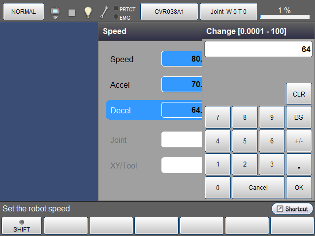 The numerical keypad is disappeared, and the deceleration is updated with the entered value as shown below. Press [OK] to confirm this value.