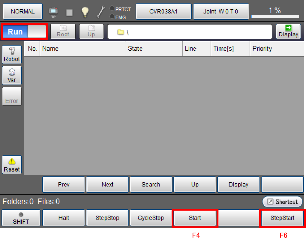 With "Run" displayed, the program can be started up pressing [F4 Start] or [F6 Step Start].