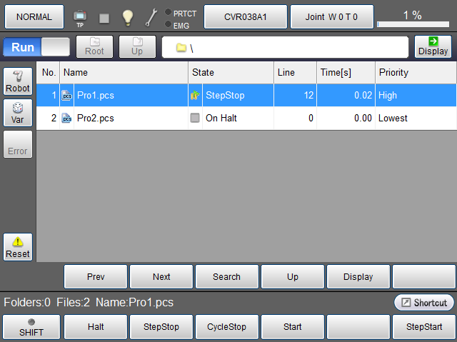 Press [F1 Halt] in the program list display window or [STOP] button on the Remote TP/Virtual TP.