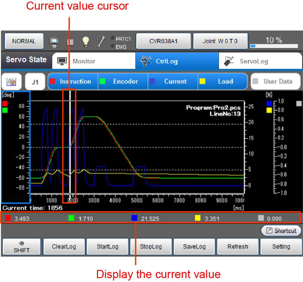 Acquire control logs of respective items including command position, encoder position, current position, and load factor and userdata (SysLog.Ctrl.UserData), and display the graph on the screen of teach pendant.Four items of each joint's control log can be displayed at the same time.