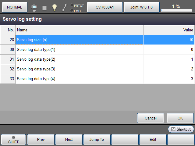 Operation path : [F2 Arm] - [F3 Servo State] - [Servo log tab] - [F6 Setting]